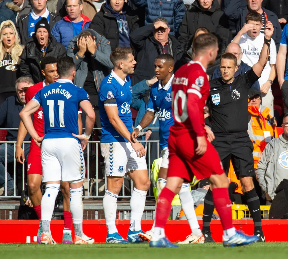 Dinge got heated at Anfield after Everton rightback Ashley Young was sent off for a second yellow in the 37th minute and then after the break, Reds defender Ibrahima Konate was lucky to escape a second yellow for a trip on Beto.