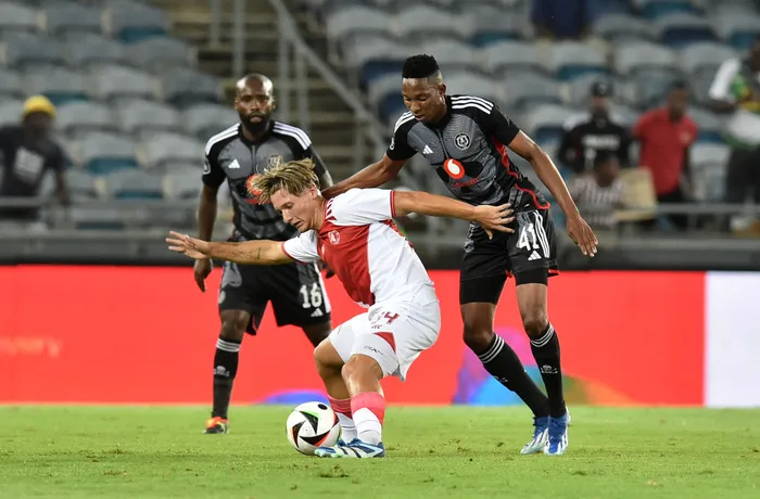 Thalente Mbatha of Orlando Pirates challenges Liam Bern of Cape Town Spurs during the DStv Premiership 2023/24 match between Orlando Pirates and Cape Town Spurs at Orlando Stadium in Soweto on 6 March 2024 ©Nokwanda Zondi/BackpagePix