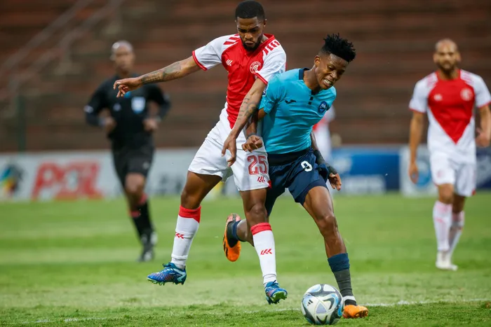 Duel: Spurs’ Siyanda Msani, left, v Richards Bay. Picture: Rogan Ward/BackpagePix