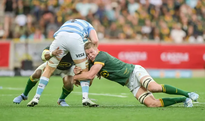 Yster: South Africa flanker Pieter-Steph du Toit makes yet another tackle against Pumas. Picture: EPA/Christiaan Kotze