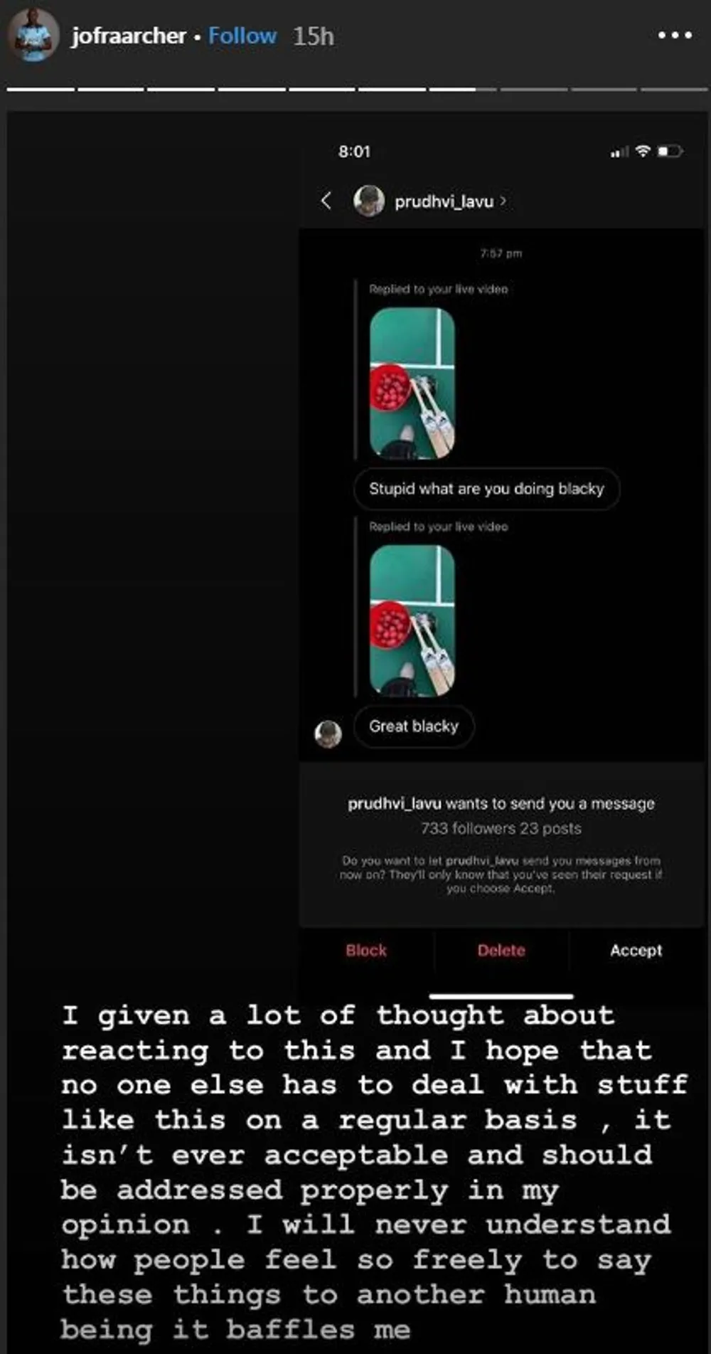 England fast bowler Jofra Archer has posted an image of racist abuse he received on social media and called on authorities to deal with the issue properly.