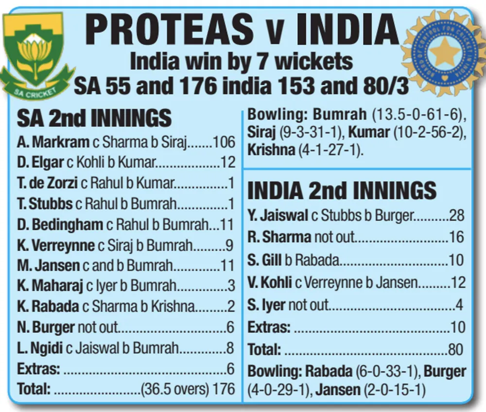 Bowled out for 55 in the first innings and 176 in the second yesterday, with Aiden Markram contributing 106, SA staged a mini comeback by bowling India out for 153 on the first day before the visitors got home with seven wickets left (80/3) shortly after lunch on Day Two.