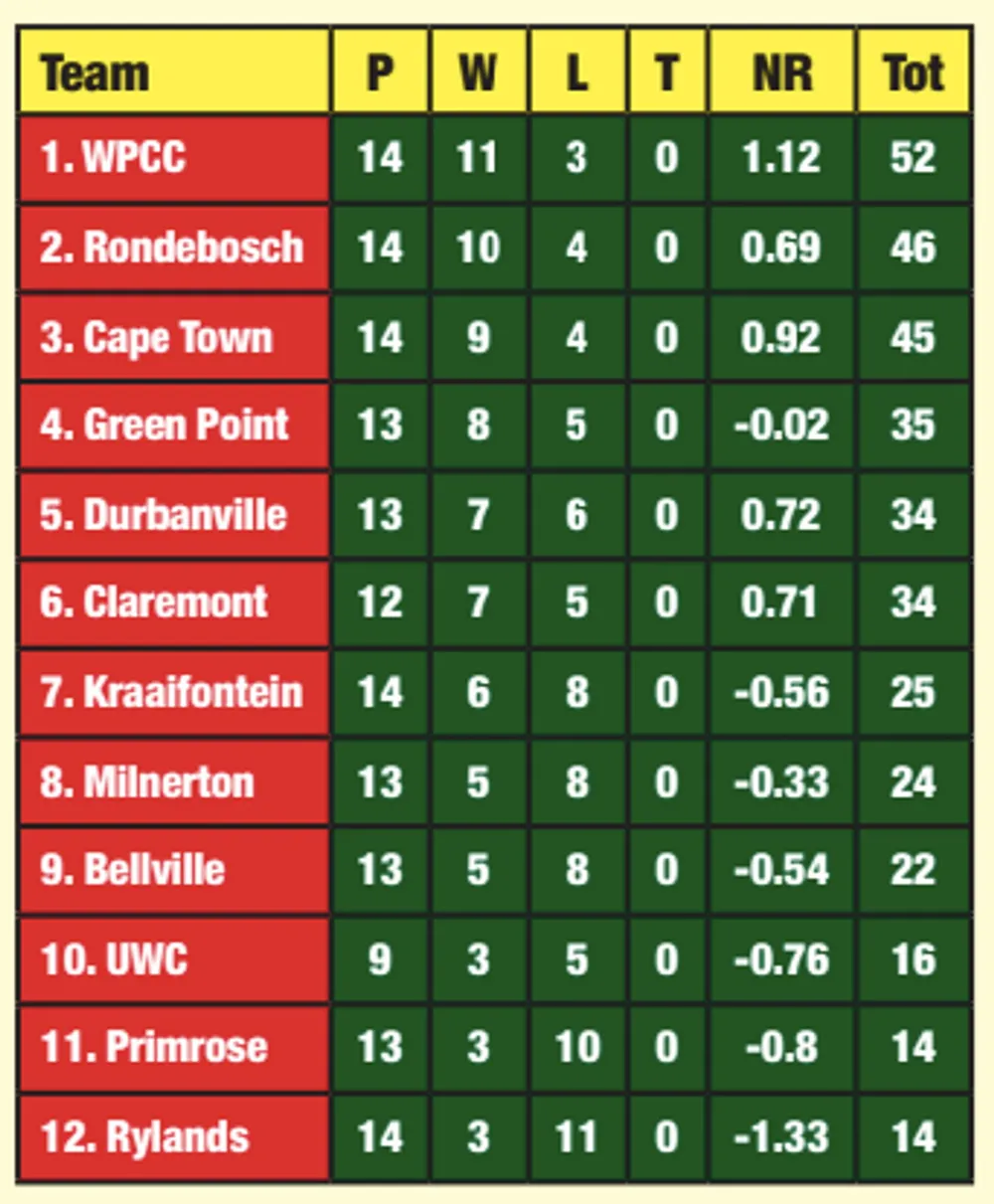 Premier League: Claremont v Bellville, Cape Town CC v Durbanville, UWC v Green Point CC, Kraaifontein v Rondebosch, Primroses v Milnerton, Western Province CC v Rylands.