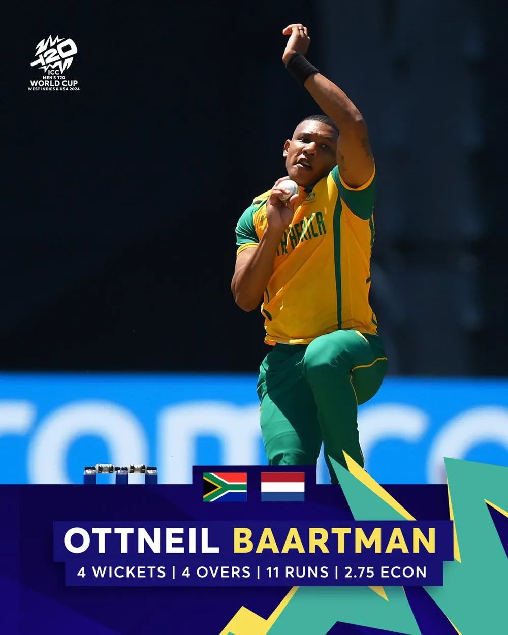 Earlier in the clash, SA’s bowlers did their bit to help the team, with Ottniel Baartman starring with his figures of 4/11 in four overs – three of those wickets coming in the final over to restrict the Dutch.