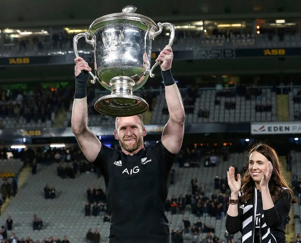 VICTOR: New Zealand's Kieran Read holds up the Bledisloe Cup trophy. Picture: David Rowland/AP.