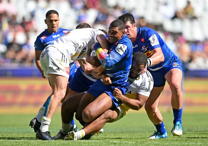 Damian Willemse of the Stormers is tackled during Investec Champions Cup 2023/24 game. Picture: Ryan Wilkisky/BackpagePix