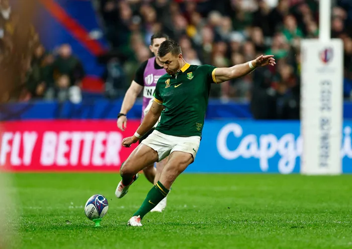 South Africa's Handre Pollard scores a penalty kick. Picture: Gonzalo Fuentes/REUTERS
