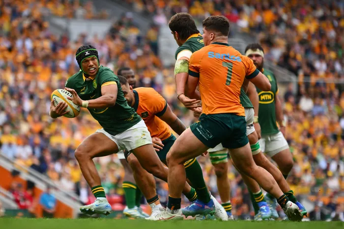 The Bok backline also showed off their class with the new man at 10 Sacha Feinberg-Mngomezulu (SFM) pulling the strings and even busting through the Wallabies’ defence from a raid started in SA’s half.