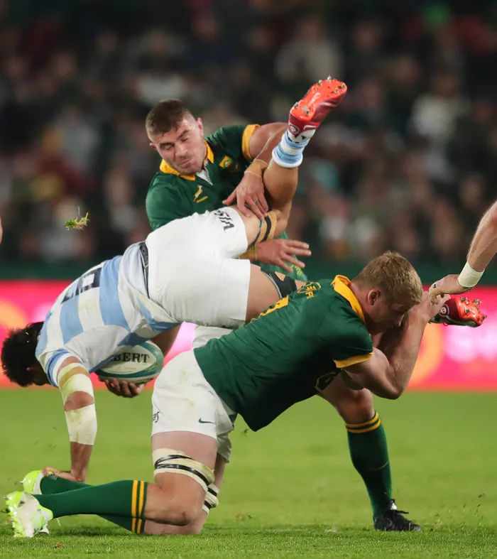Pablo Matera of Argentina tackled by Malcolm Marx and Pieter-Steph du Toit of South Africa during the 2023 Castle Lager Rugby Championship.