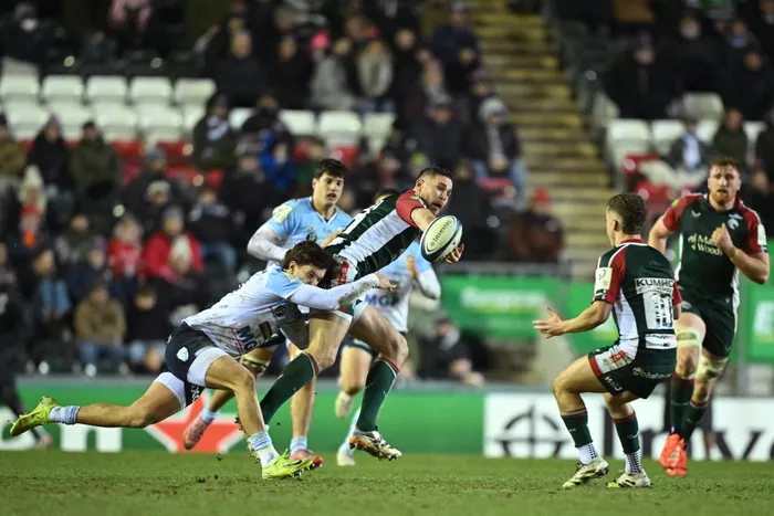 A HANDFUL: Leicester’s England fullback Freddie Steward offloads