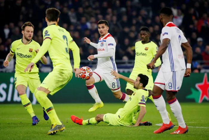 Lyon's Houssem Aouar in action with Barcelona's Sergio Busquets, Ousmane Dembele and Ivan Rakitic. Photo: Jean-Paul Pelissier/Reuters Lyon's Houssem Aouar in action with Barcelona's Sergio Busquets, Ousmane Dembele and Ivan Rakitic. Photo: Jean-Paul Pelissier/Reuters