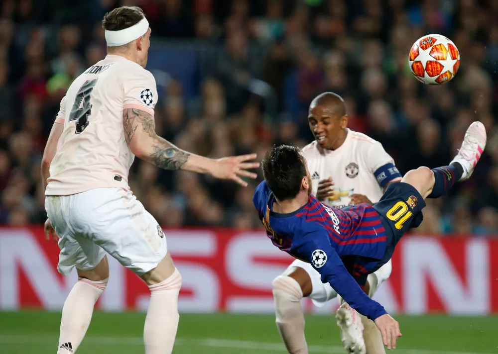 Barcelona forward Lionel Messi tries to score with a bicycle kick during the Champions League quarterfinal. Photo: Joan Monfort/AP