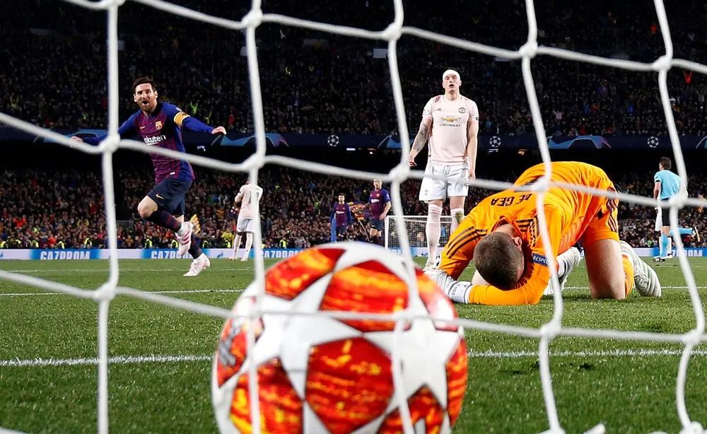 Barcelona's Lionel Messi celebrates scoring their second goal as Manchester United's David de Gea reacts. Photo: Sergio Perez/Reuters