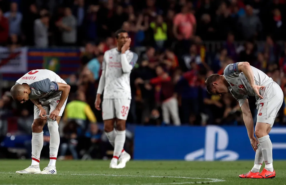 Liverpool's Fabinho, Joel Matip and James Milner, from left to right, react after Barcelona scored their third goal. Photo: Joan Monfort/AP