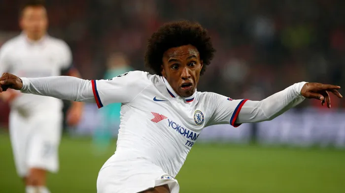 BRILLIANT: Chelsea's Willian volley's in his sides second goal. Picture: Michel Spingler/AP. BRILLIANT: Chelsea's Willian volley's in his sides second goal. Picture: Michel Spingler/AP.