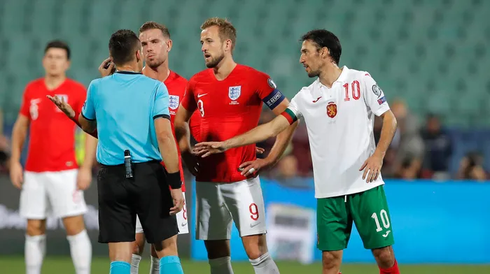 PAUSE: Harry Kane, center, and Jordan Henderson speak with Croatian referee Ivan Bebek. Picture: Vadim Ghirda/AP. PAUSE: Harry Kane, center, and Jordan Henderson speak with Croatian referee Ivan Bebek. Picture: Vadim Ghirda/AP.