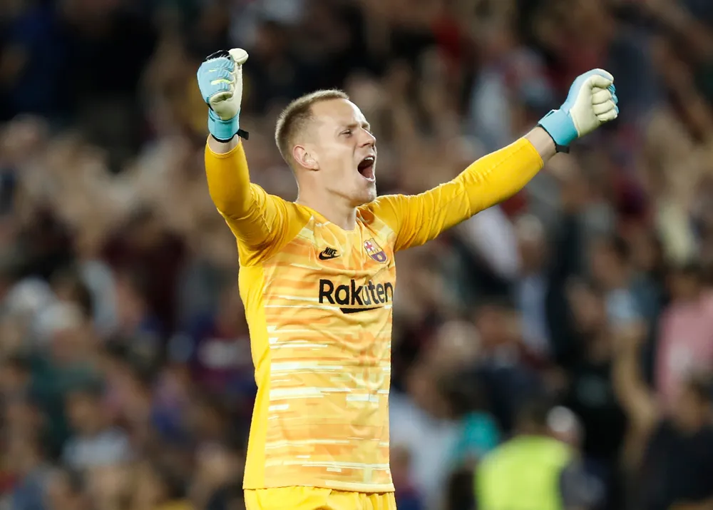 UNLUCKY: Marc-Andre ter Stegen celebrates the victory after conceeding a goal. Picture: Joan Monfort/AP.