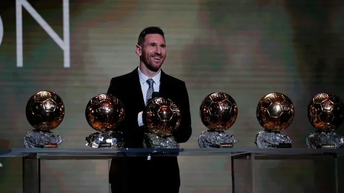 BALLON D'OR: Lionel Messi poses with his six golden balls Picture: Francois Mori/AP. BALLON D'OR: Lionel Messi poses with his six golden balls Picture: Francois Mori/AP.