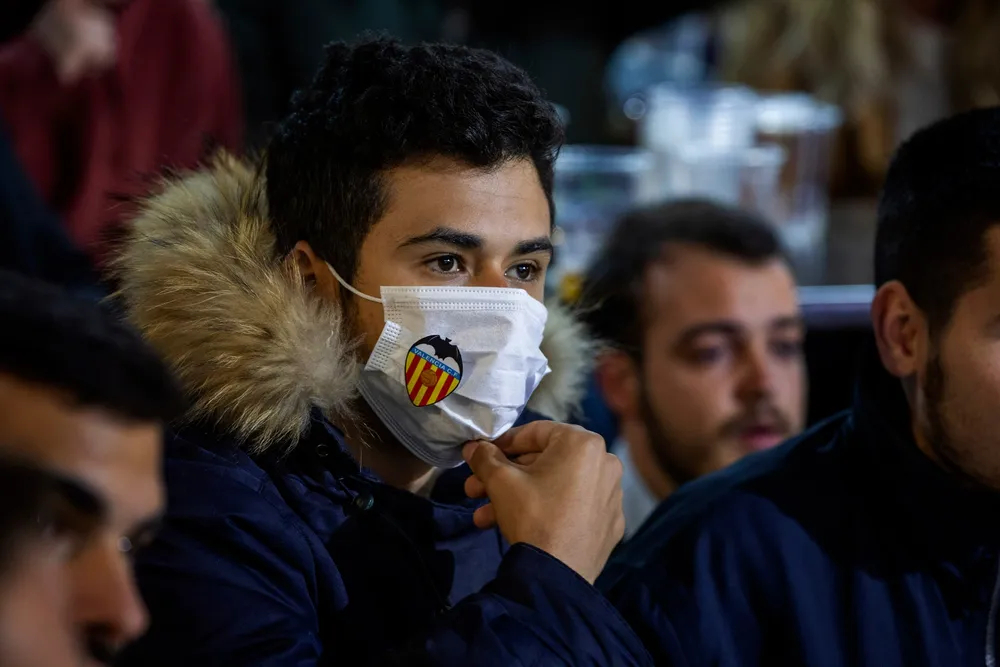 PROTECTED: Valencia supporters try to protect themselves from COVID-19. Picture: Emilio Morenatti/AP.