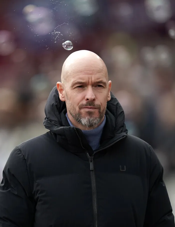 Bubbles burst on Manchester United manager Erik ten Hag during the Premier League match at the London Stadium. Picture date: Saturday December 23, 2023.