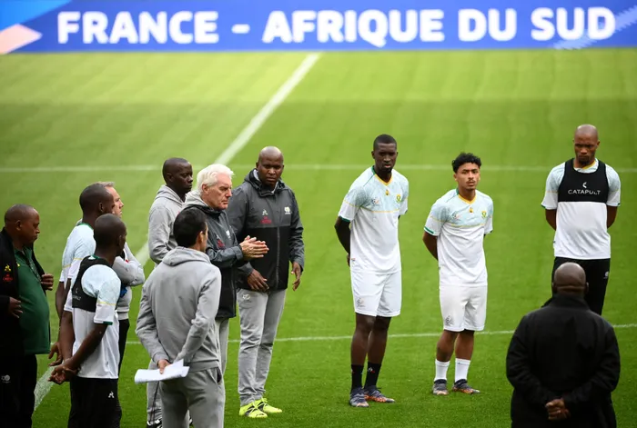 South Africa’s Belgian head coach Hugo Broos (C) speaks to his players during a training session at the Pierre-Mauroy Stadium in Villeneuve d'Ascq, northern France File. Bafana have met Mali, their opponents in their Africa Cup of Nations opener on Tuesday, twice before in the Africa showpiece event and on both occasions were defeated by the West Africans. Seen here: Hugo Broos speaks during a Bafana training session. Picture: Franck Fife/AFP
