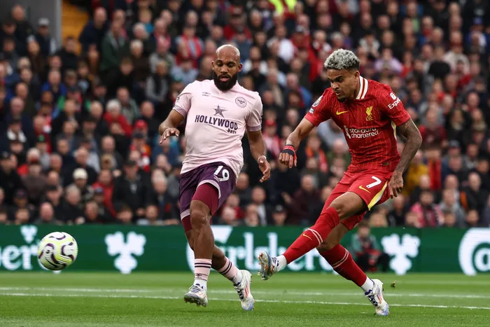 SCORE: Liverpool’s Luis Diaz scores the team's first goal during the English Premier League football match between Liverpool and Brentford at Anfield.