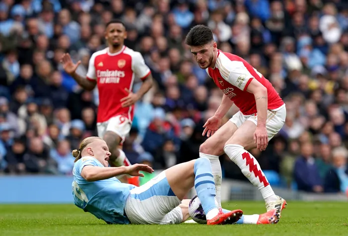 HOTSHOT: Man City ace Erling Haaland, left, fights Gunner Declan Rice, right, for the ball