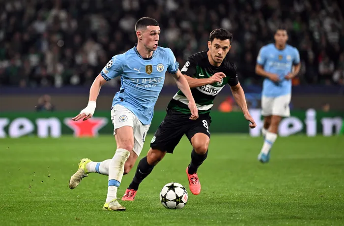 DESPERATE FOR A WIN: Manchester City’s Phil Foden, left, v Sporting Lisbon